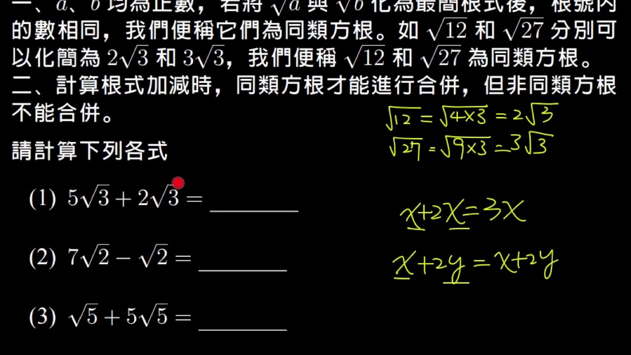 載入中... 相關課程 Back 【觀念】同類方根與根式的加減 相關課程 0 / 750 登入觀看 ⇐ Use this menu to view and help create subtitles for this video in many different languages. You'll probably want to hide YouTube's captions if using these subtitles. 【觀念】同類方根與根式的加減 上傳學習單 下載學習單