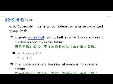 載入中... 相關課程 Back society: 社會, social, 社會的, sociable, 號社交的, socialize, 交際 相關課程 0 / 750 登入觀看 ⇐ Use this menu to view and help create subtitles for this video in many different languages. You'll probably want to hide YouTube's captions if using these subtitles. society: 社會, social, 社會的, sociable, 號社交的, socialize, 交際 上傳學習單 下載學習單