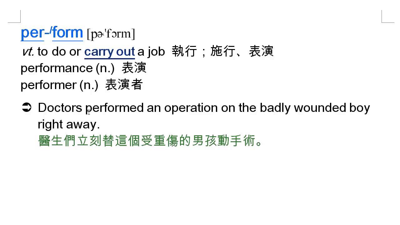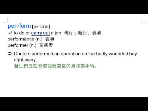 載入中... 相關課程 Back perform: 執行, 施行, 表演, performer, performance 相關課程 0 / 750 登入觀看 ⇐ Use this menu to view and help create subtitles for this video in many different languages. You'll probably want to hide YouTube's captions if using these subtitles. perform: 執行, 施行, 表演, performer, performance 上傳學習單 下載學習單