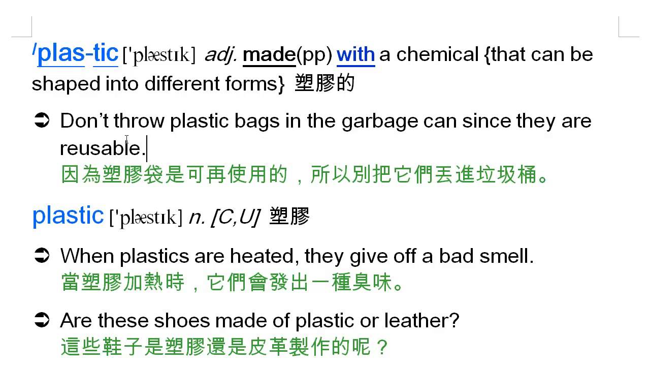 載入中... 相關課程 Back plastic: 塑膠的, 塑膠, reusable 相關課程 0 / 750 登入觀看 ⇐ Use this menu to view and help create subtitles for this video in many different languages. You'll probably want to hide YouTube's captions if using these subtitles. plastic: 塑膠的, 塑膠, reusable 上傳學習單 下載學習單