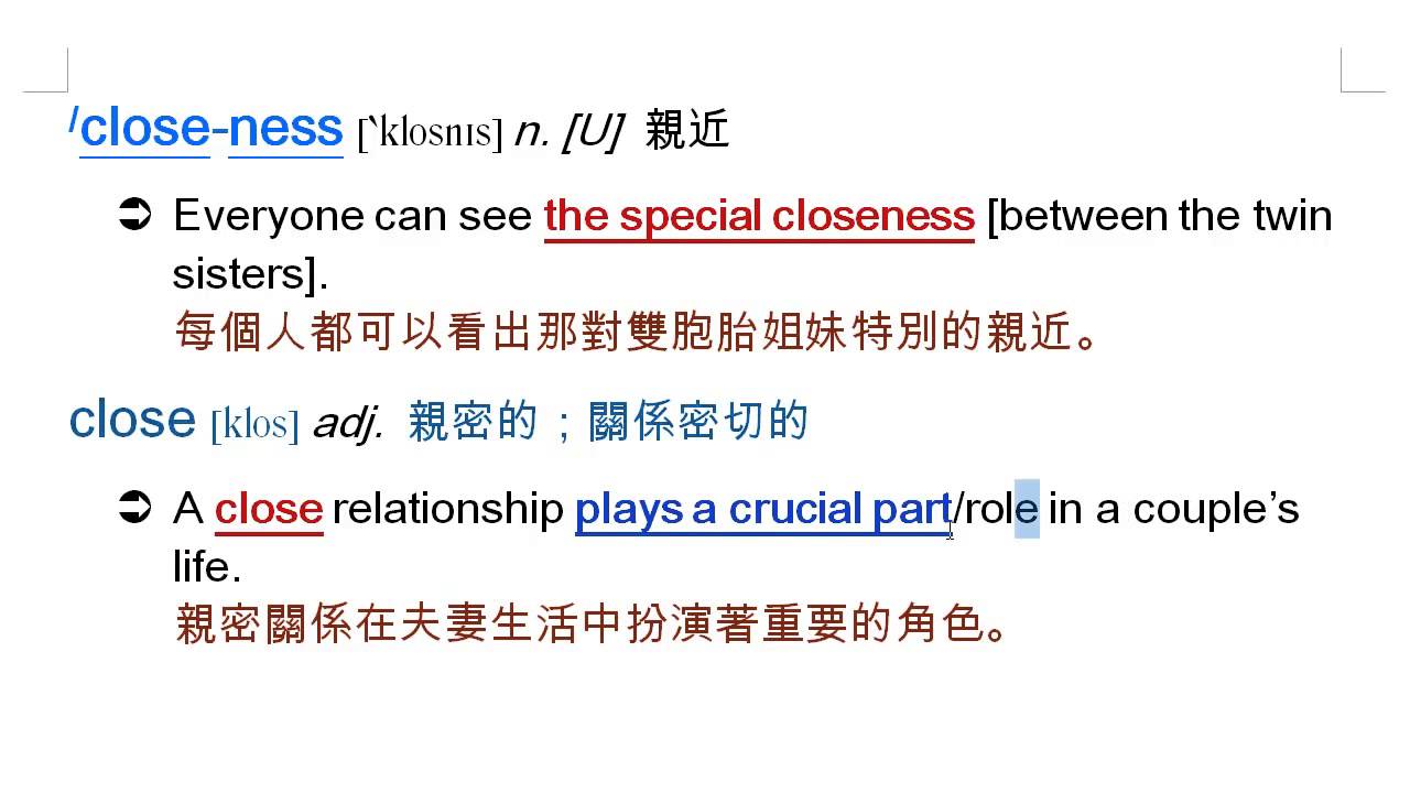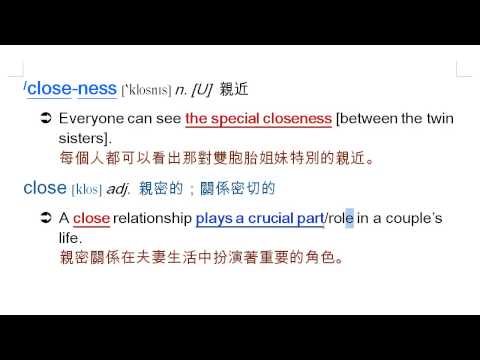 載入中... 相關課程 Back closeness: 親近, 親密的;關係密切的, get close to, 接近 相關課程 0 / 750 登入觀看 ⇐ Use this menu to view and help create subtitles for this video in many different languages. You'll probably want to hide YouTube's captions if using these subtitles. closeness: 親近, 親密的;關係密切的, get close to, 接近 上傳學習單 下載學習單