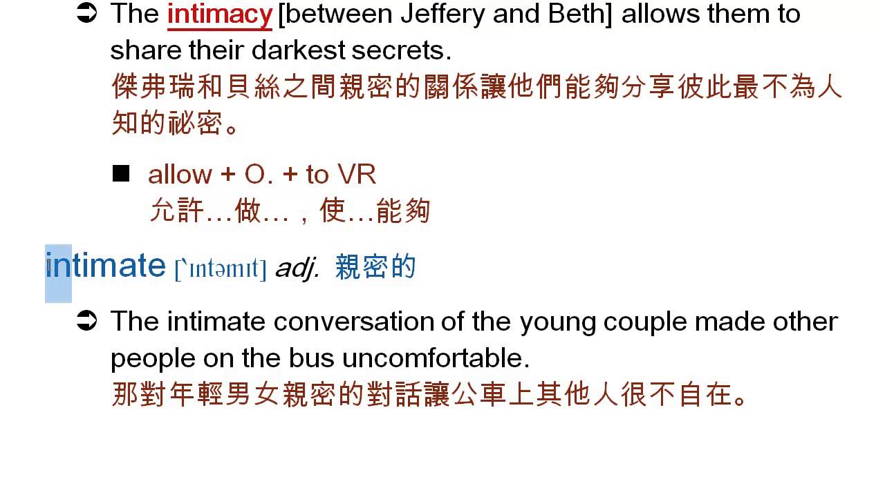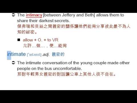 載入中... 相關課程 Back intimacy: 親密, intimate, 親密的, allow, 允許 相關課程 0 / 750 登入觀看 ⇐ Use this menu to view and help create subtitles for this video in many different languages. You'll probably want to hide YouTube's captions if using these subtitles. intimacy: 親密, intimate, 親密的, allow, 允許 上傳學習單 下載學習單