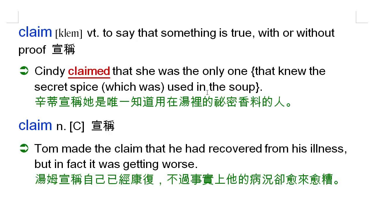 載入中... 相關課程 Back claim: claim, 宣稱;要求;奪去 相關課程 0 / 750 登入觀看 ⇐ Use this menu to view and help create subtitles for this video in many different languages. You'll probably want to hide YouTube's captions if using these subtitles. claim: claim, 宣稱;要求;奪去 上傳學習單 下載學習單