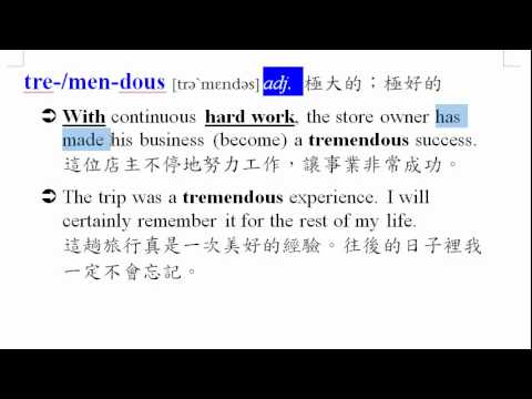 載入中... 相關課程 Back tremendous: huge, colossal, gigantic, enormous, massive 相關課程 0 / 750 登入觀看 ⇐ Use this menu to view and help create subtitles for this video in many different languages. You'll probably want to hide YouTube's captions if using these subtitles. tremendous: huge, colossal, gigantic, enormous, massive 上傳學習單 下載學習單
