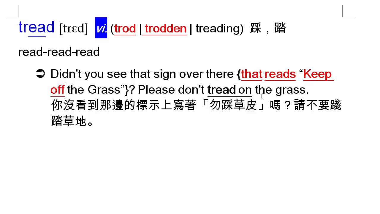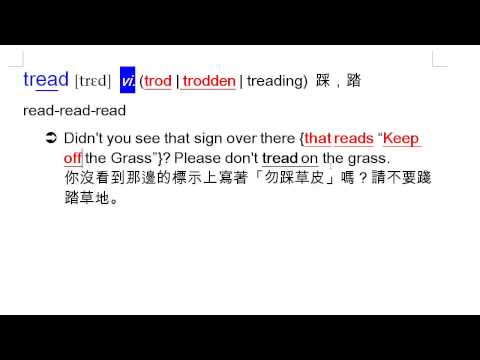 載入中... 相關課程 Back tread, trod, trodden, 踐踏, 踩, tread on, thread, 線 相關課程 0 / 750 登入觀看 ⇐ Use this menu to view and help create subtitles for this video in many different languages. You'll probably want to hide YouTube's captions if using these subtitles. tread, trod, trodden, 踐踏, 踩, tread on, thread, 線 上傳學習單 下載學習單
