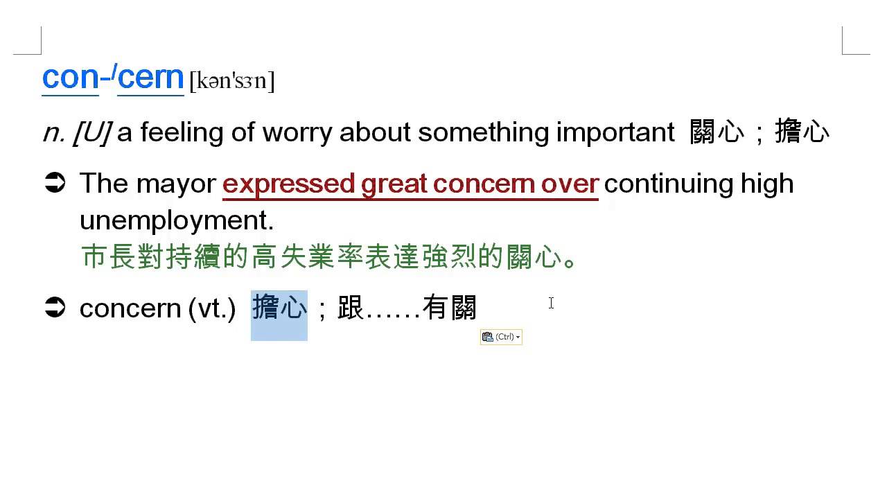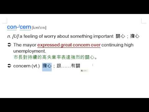 載入中... 相關課程 Back concern: 關心, 擔心, concerned, 擔心的, 煩惱的, concerning, 關於 相關課程 0 / 750 登入觀看 ⇐ Use this menu to view and help create subtitles for this video in many different languages. You'll probably want to hide YouTube's captions if using these subtitles. concern: 關心, 擔心, concerned, 擔心的, 煩惱的, concerning, 關於 上傳學習單 下載學習單