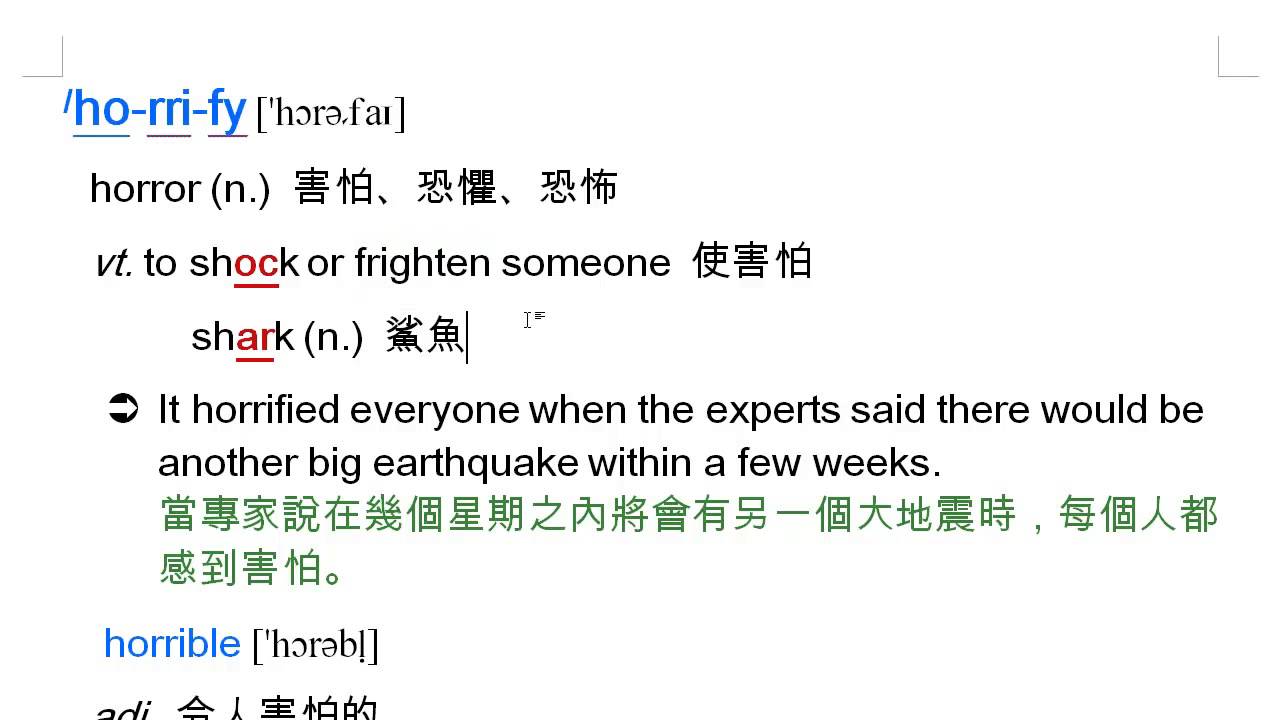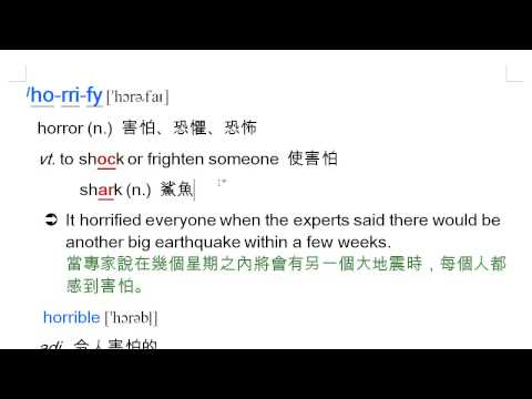 載入中... 相關課程 Back horrify: 使害怕, horrible, horrified, horror 相關課程 0 / 750 登入觀看 ⇐ Use this menu to view and help create subtitles for this video in many different languages. You'll probably want to hide YouTube's captions if using these subtitles. horrify: 使害怕, horrible, horrified, horror 上傳學習單 下載學習單