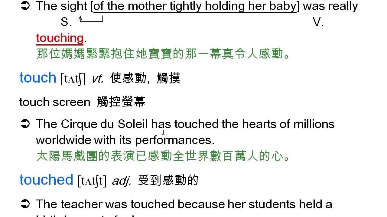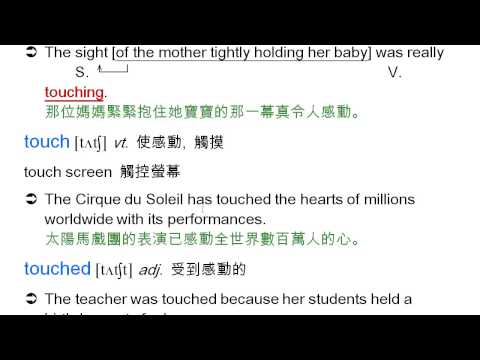 載入中... 相關課程 Back touching: 令人感動的, touch, touch screen, touched, 感到感動的 相關課程 0 / 750 登入觀看 ⇐ Use this menu to view and help create subtitles for this video in many different languages. You'll probably want to hide YouTube's captions if using these subtitles. touching: 令人感動的, touch, touch screen, touched, 感到感動的 上傳學習單 下載學習單