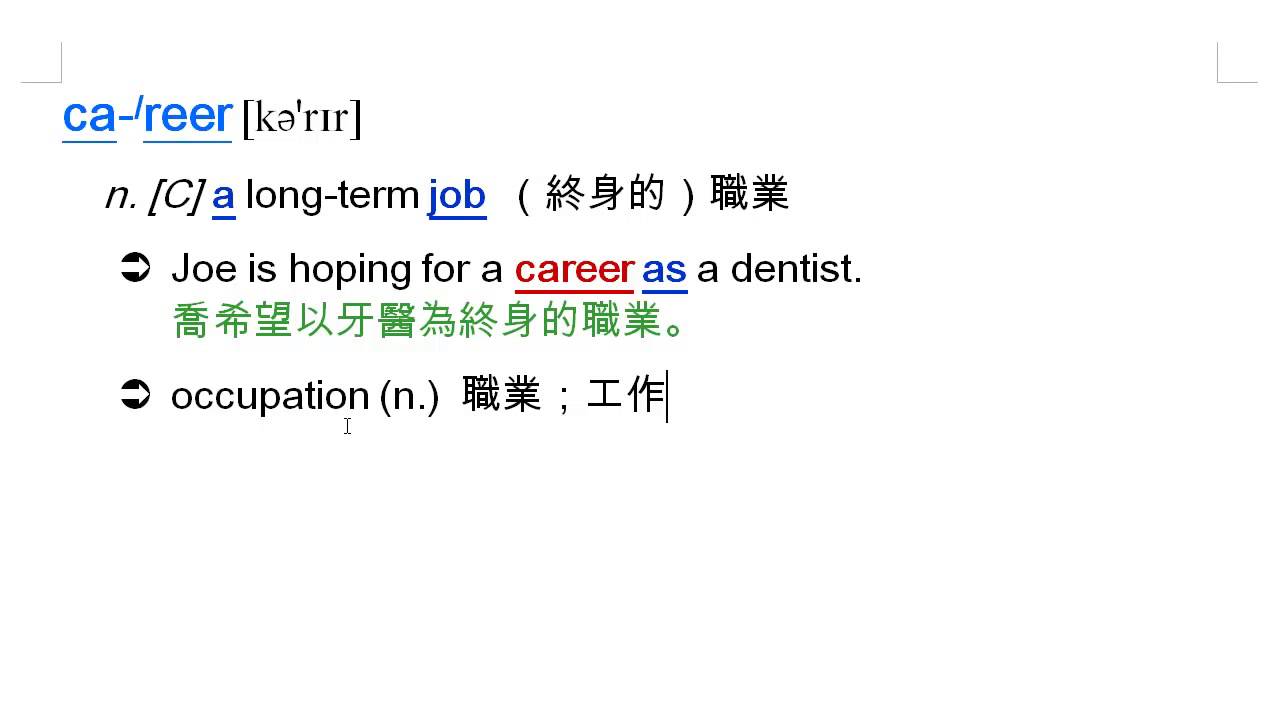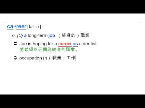 載入中... 相關課程 Back career: 職業, occupation, job, work, profession, 專業 相關課程 0 / 750 登入觀看 ⇐ Use this menu to view and help create subtitles for this video in many different languages. You'll probably want to hide YouTube's captions if using these subtitles. career: 職業, occupation, job, work, profession, 專業 上傳學習單 下載學習單