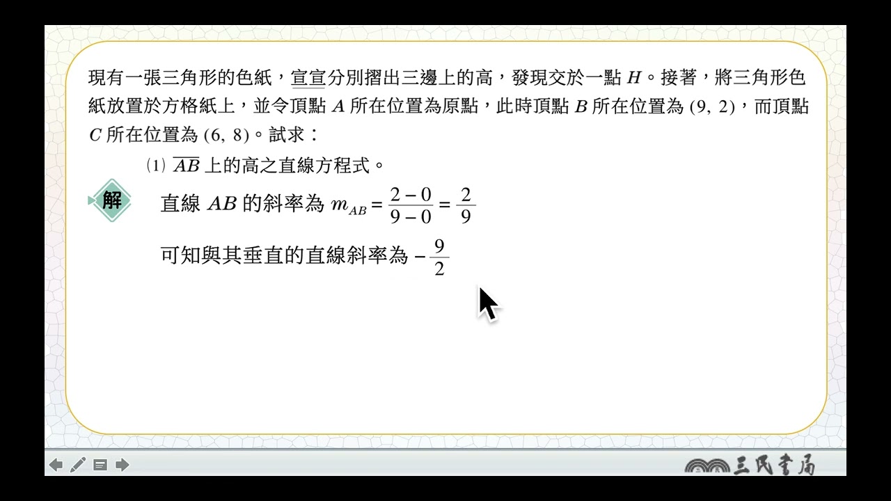 載入中... 相關課程 Back 【解題】建立坐標系求直線方程式 相關課程 0 / 750 登入觀看 ⇐ Use this menu to view and help create subtitles for this video in many different languages. You'll probably want to hide YouTube's captions if using these subtitles. 【解題】建立坐標系求直線方程式 上傳學習單 下載學習單