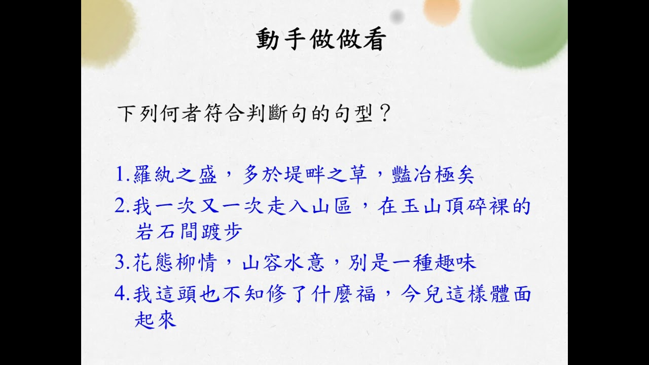 載入中... 相關課程 Back 語法[十]/判斷句 相關課程 0 / 750 登入觀看 ⇐ Use this menu to view and help create subtitles for this video in many different languages. You'll probably want to hide YouTube's captions if using these subtitles. 語法[十]/判斷句 上傳學習單 下載學習單