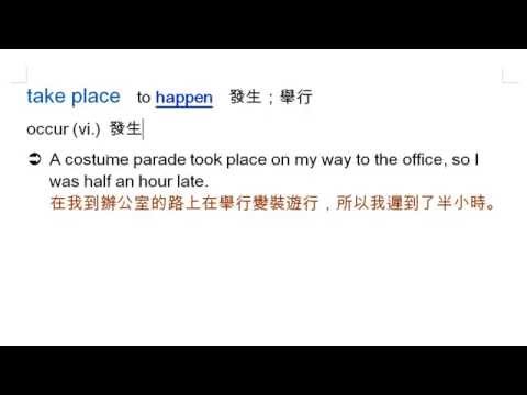載入中... 相關課程 Back take place: 發生, happen, occur 相關課程 0 / 750 登入觀看 ⇐ Use this menu to view and help create subtitles for this video in many different languages. You'll probably want to hide YouTube's captions if using these subtitles. take place: 發生, happen, occur 上傳學習單 下載學習單