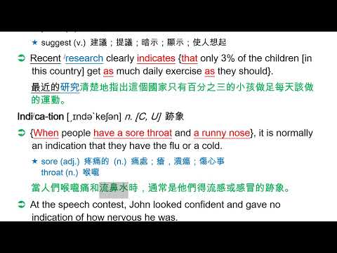 載入中... 相關課程 Back indicate [`ɪndəˏket] vt. 指出 相關課程 0 / 750 登入觀看 ⇐ Use this menu to view and help create subtitles for this video in many different languages. You'll probably want to hide YouTube's captions if using these subtitles. indicate [`ɪndəˏket] vt. 指出 上傳學習單 下載學習單