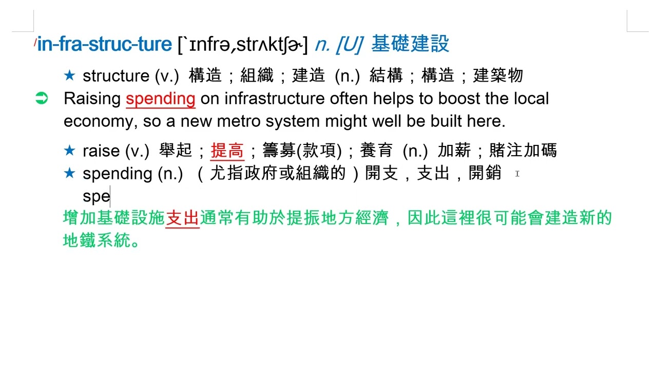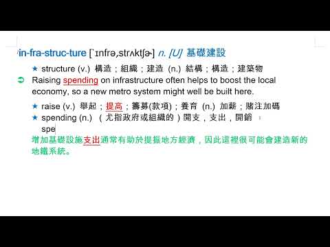 載入中... 相關課程 Back infrastructure [`ɪnfrə͵strʌktʃɚ] n. [U] 基礎建設 相關課程 0 / 750 登入觀看 ⇐ Use this menu to view and help create subtitles for this video in many different languages. You'll probably want to hide YouTube's captions if using these subtitles. infrastructure [`ɪnfrə͵strʌktʃɚ] n. [U] 基礎建設 上傳學習單 下載學習單