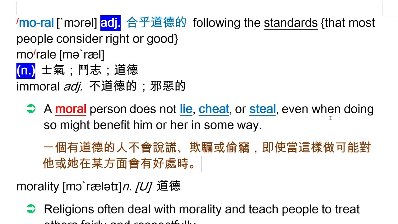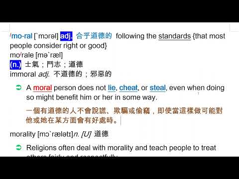 載入中... 相關課程 Back moral [`mɔrəl] adj. 合乎道德的 相關課程 0 / 750 登入觀看 ⇐ Use this menu to view and help create subtitles for this video in many different languages. You'll probably want to hide YouTube's captions if using these subtitles. moral [`mɔrəl] adj. 合乎道德的 上傳學習單 下載學習單