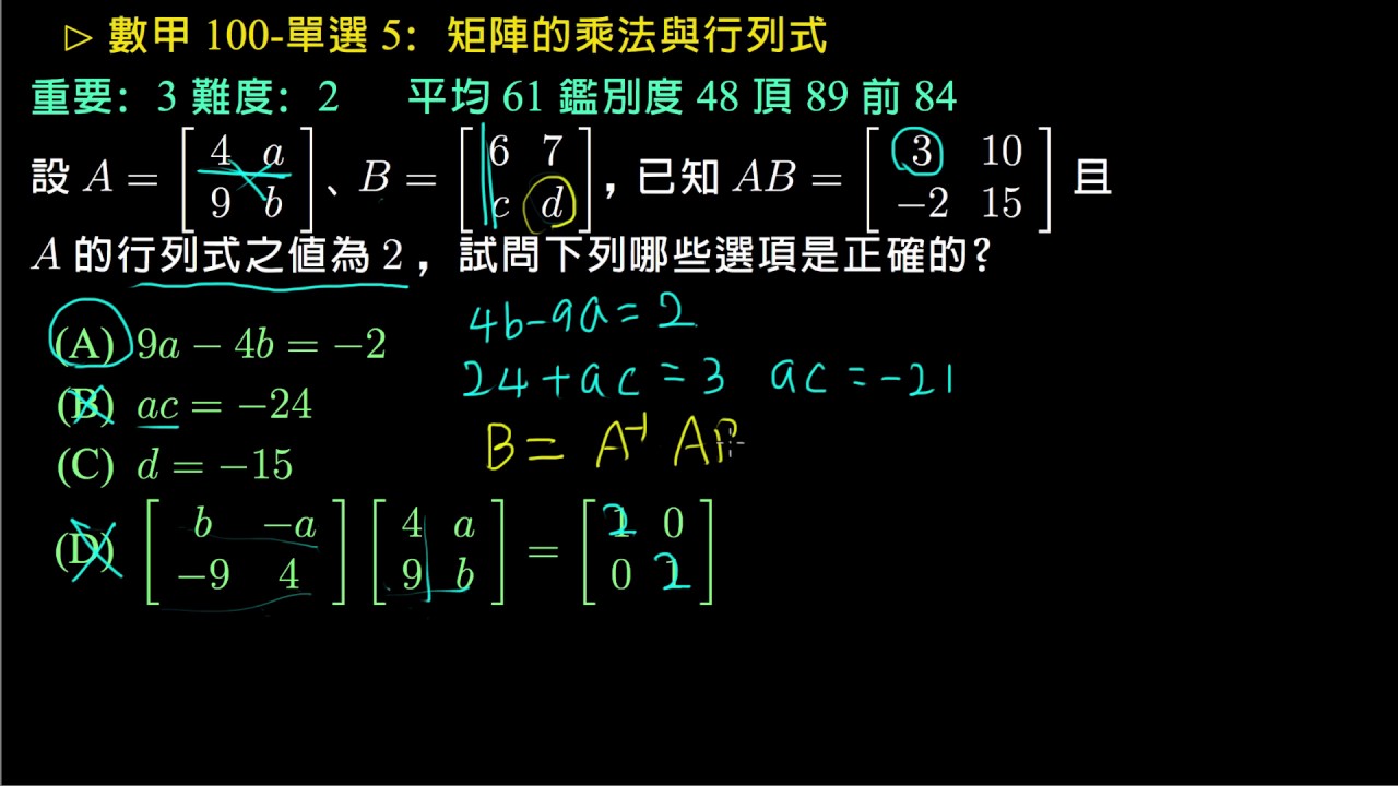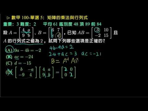 載入中... 相關課程 Back 【數甲】100 多選5 矩陣的乘法與行列式 相關課程 0 / 750 登入觀看 ⇐ Use this menu to view and help create subtitles for this video in many different languages. You'll probably want to hide YouTube's captions if using these subtitles. 【數甲】100 多選5 矩陣的乘法與行列式 上傳學習單 下載學習單