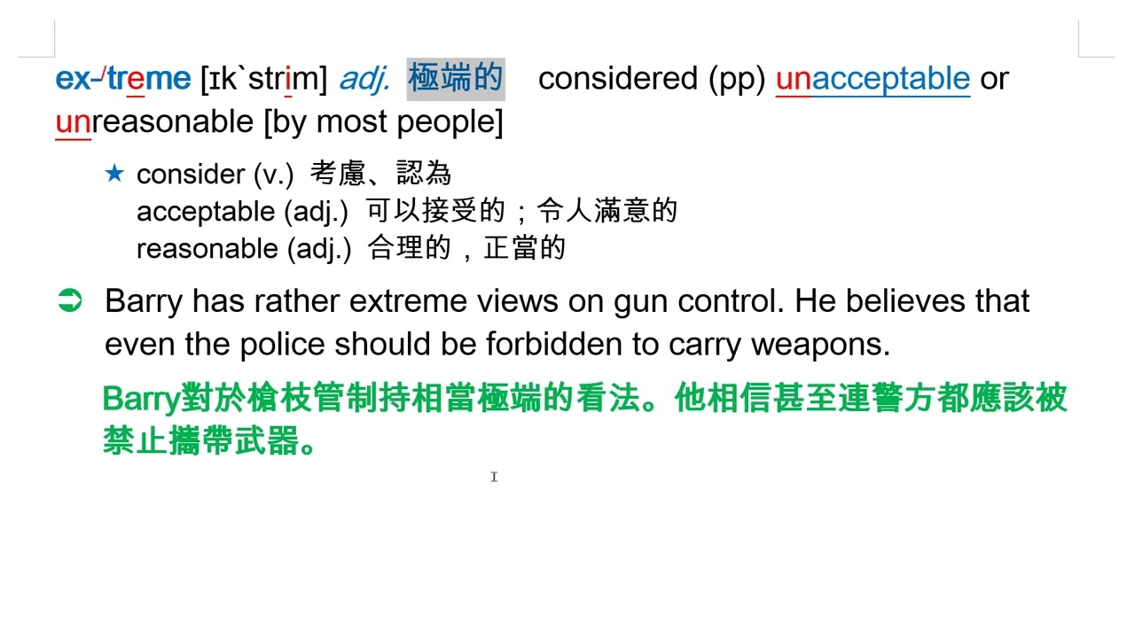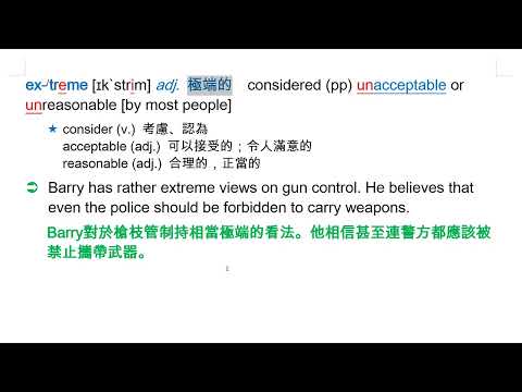 載入中... 相關課程 Back extreme [ɪk`strim] adj. 極端的 相關課程 0 / 750 登入觀看 ⇐ Use this menu to view and help create subtitles for this video in many different languages. You'll probably want to hide YouTube's captions if using these subtitles. extreme [ɪk`strim] adj. 極端的 上傳學習單 下載學習單