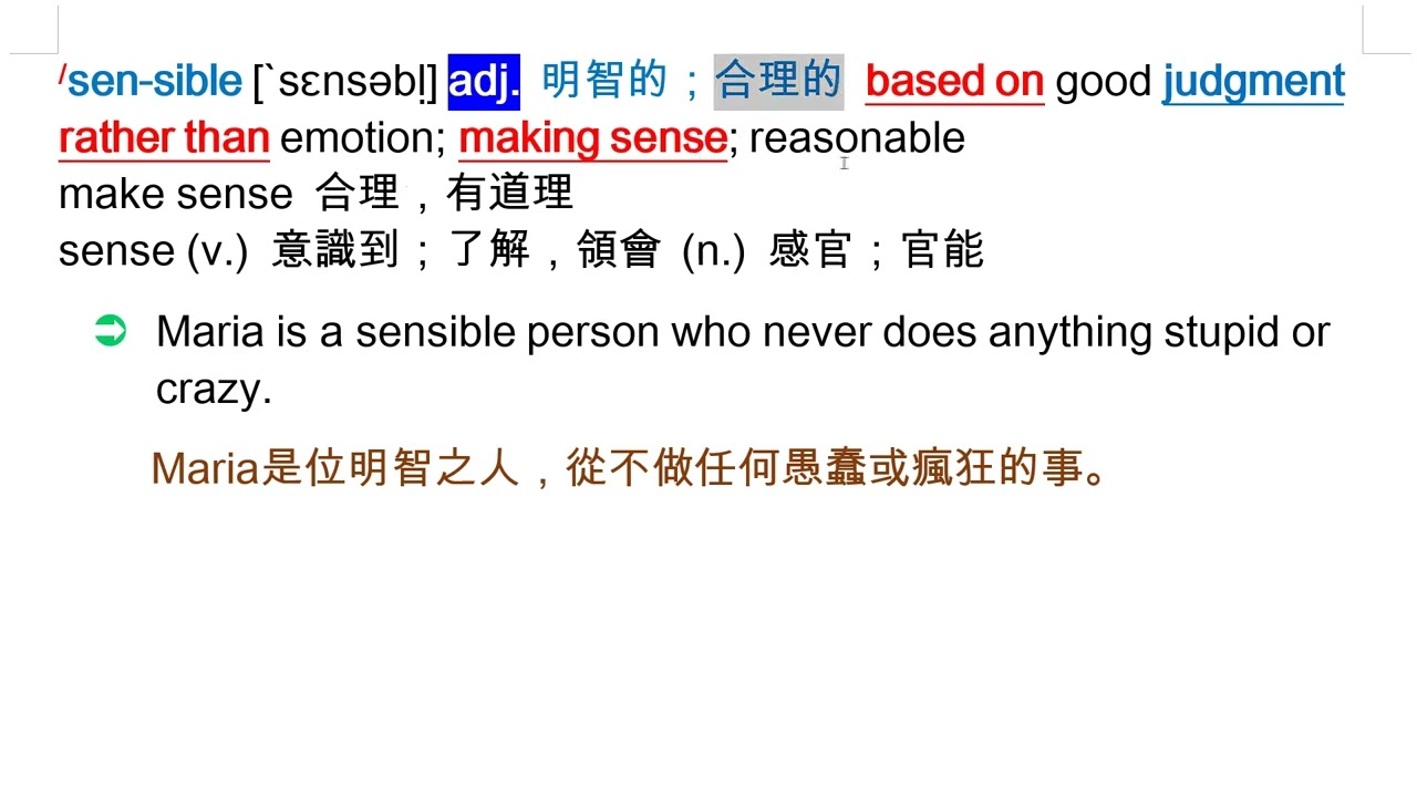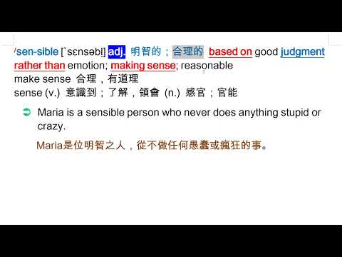 載入中... 相關課程 Back sensible [`sɛnsəbḷ] adj. 明智的;合理的 相關課程 0 / 750 登入觀看 ⇐ Use this menu to view and help create subtitles for this video in many different languages. You'll probably want to hide YouTube's captions if using these subtitles. sensible [`sɛnsəbḷ] adj. 明智的;合理的 上傳學習單 下載學習單
