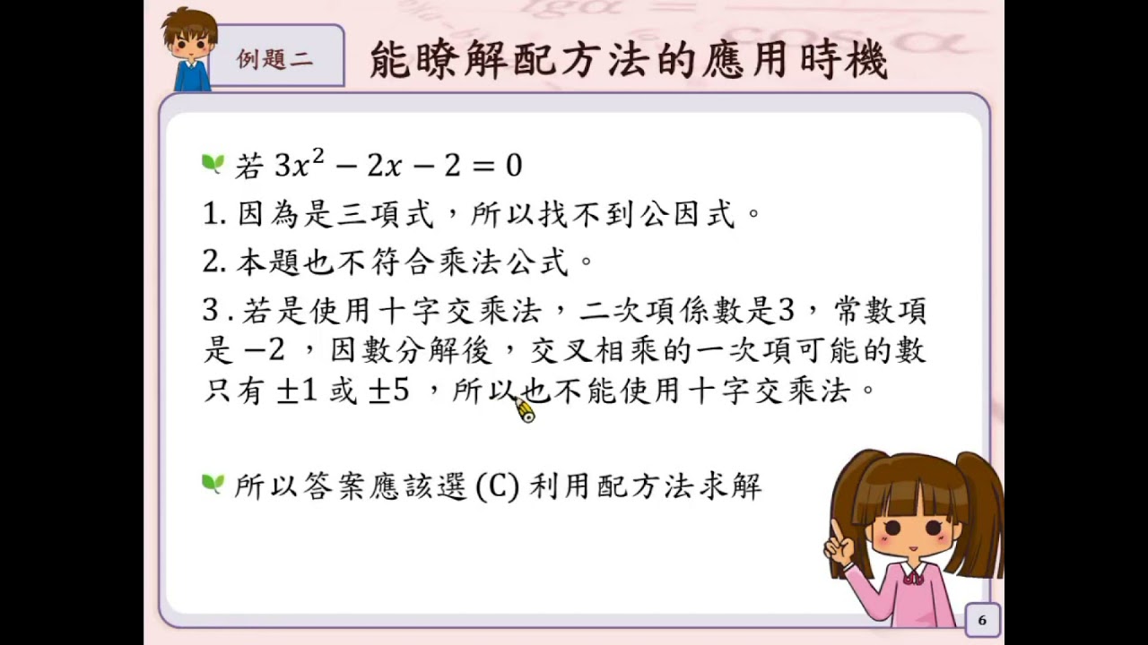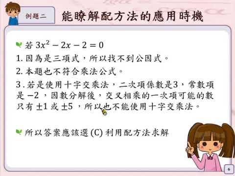 載入中... 相關課程 Back A-8-7-S06_能理解當無法利用因式分解法來解一元二次方程式時,可用配方法來解一元二次方程式。 相關課程 0 / 750 登入觀看 ⇐ Use this menu to view and help create subtitles for this video in many different languages. You'll probably want to hide YouTube's captions if using these subtitles. A-8-7-S06_能理解當無法利用因式分解法來解一元二次方程式時,可用配方法來解一元二次方程式。 上傳學習單 下載學習單