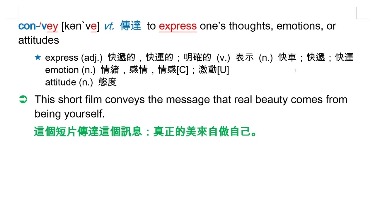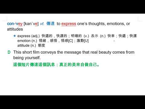 載入中... 相關課程 Back convey [kən`ve] vt. 傳達 相關課程 0 / 750 登入觀看 ⇐ Use this menu to view and help create subtitles for this video in many different languages. You'll probably want to hide YouTube's captions if using these subtitles. convey [kən`ve] vt. 傳達 上傳學習單 下載學習單