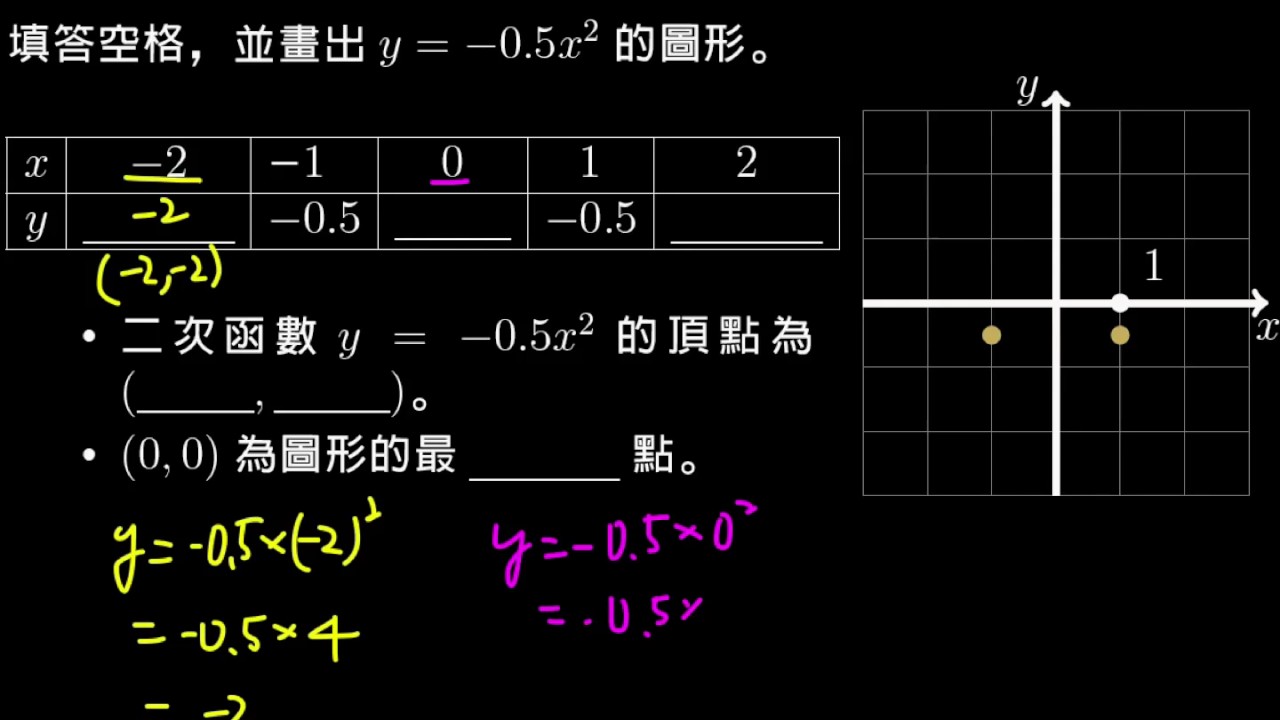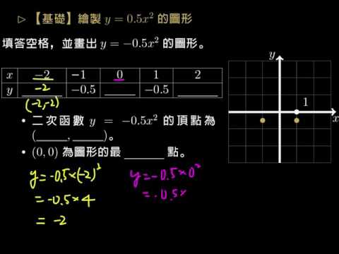 載入中... 相關課程 Back 【例題】繪製 y=0.5 x^2 的圖形 相關課程 0 / 750 登入觀看 ⇐ Use this menu to view and help create subtitles for this video in many different languages. You'll probably want to hide YouTube's captions if using these subtitles. 【例題】繪製 y=0.5 x^2 的圖形 上傳學習單 下載學習單