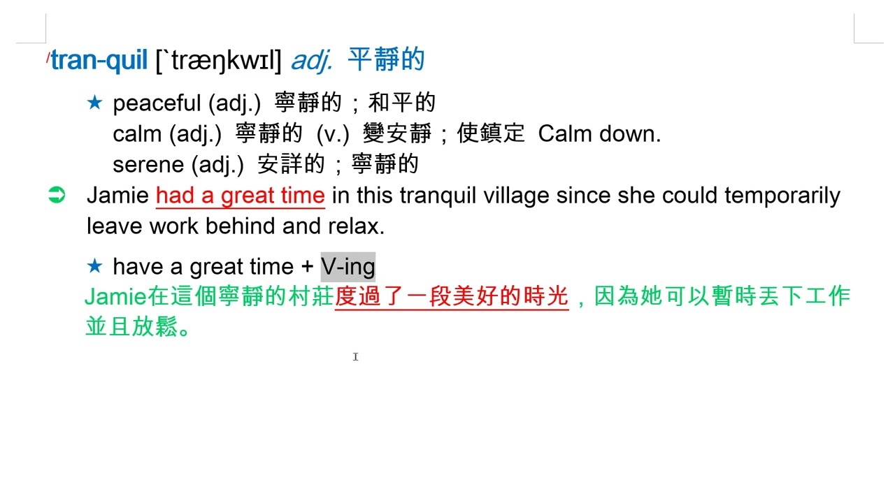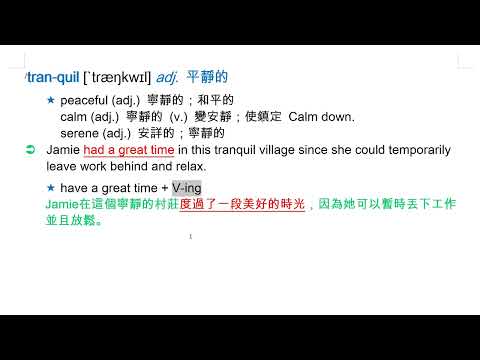 載入中... 相關課程 Back tranquil [`træŋkwɪl] adj. 平靜的 相關課程 0 / 750 登入觀看 ⇐ Use this menu to view and help create subtitles for this video in many different languages. You'll probably want to hide YouTube's captions if using these subtitles. tranquil [`træŋkwɪl] adj. 平靜的 上傳學習單 下載學習單