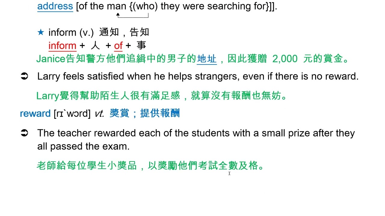 載入中... 相關課程 Back reward [rɪ`wɔrd] n. [C, U] 獎勵;報酬 相關課程 0 / 750 登入觀看 ⇐ Use this menu to view and help create subtitles for this video in many different languages. You'll probably want to hide YouTube's captions if using these subtitles. reward [rɪ`wɔrd] n. [C, U] 獎勵;報酬 上傳學習單 下載學習單