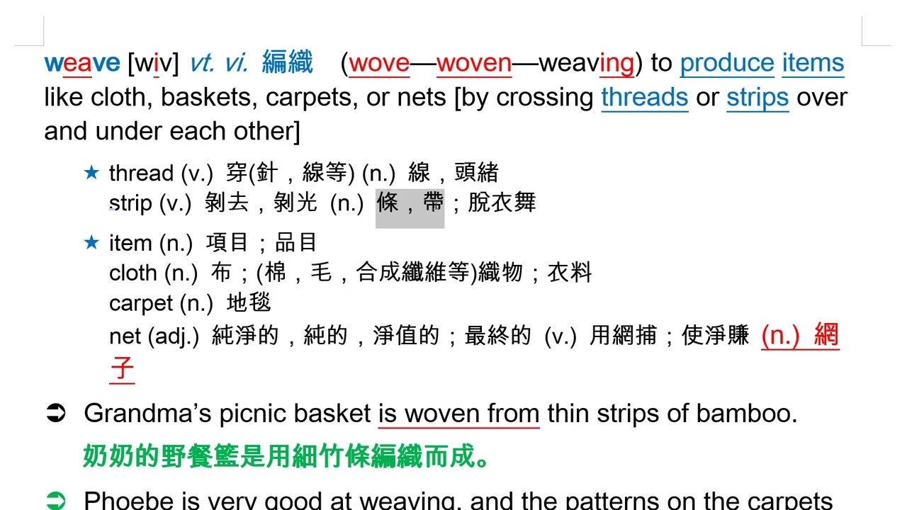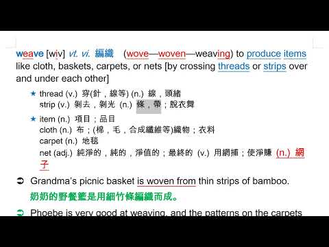 載入中... 相關課程 Back weave [wiv] vt. vi. 編織 相關課程 0 / 750 登入觀看 ⇐ Use this menu to view and help create subtitles for this video in many different languages. You'll probably want to hide YouTube's captions if using these subtitles. weave [wiv] vt. vi. 編織 上傳學習單 下載學習單