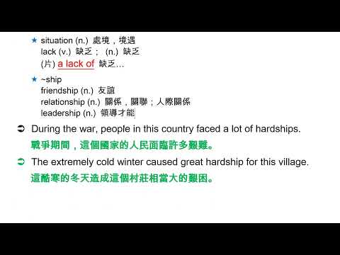 載入中... 相關課程 Back hardship [`hɑrdʃɪp] n. [C, U] 艱難 相關課程 0 / 750 登入觀看 ⇐ Use this menu to view and help create subtitles for this video in many different languages. You'll probably want to hide YouTube's captions if using these subtitles. hardship [`hɑrdʃɪp] n. [C, U] 艱難 上傳學習單 下載學習單