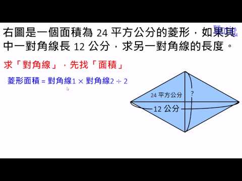 載入中... 相關課程 Back 求菱形「對角線長度」的基本練習 相關課程 0 / 750 登入觀看 ⇐ Use this menu to view and help create subtitles for this video in many different languages. You'll probably want to hide YouTube's captions if using these subtitles. 求菱形「對角線長度」的基本練習 : 小學五年級數學面積教學,本影片在練習如何利用面積來求菱形的「對角線」的基本計算方式。 上傳學習單 下載學習單