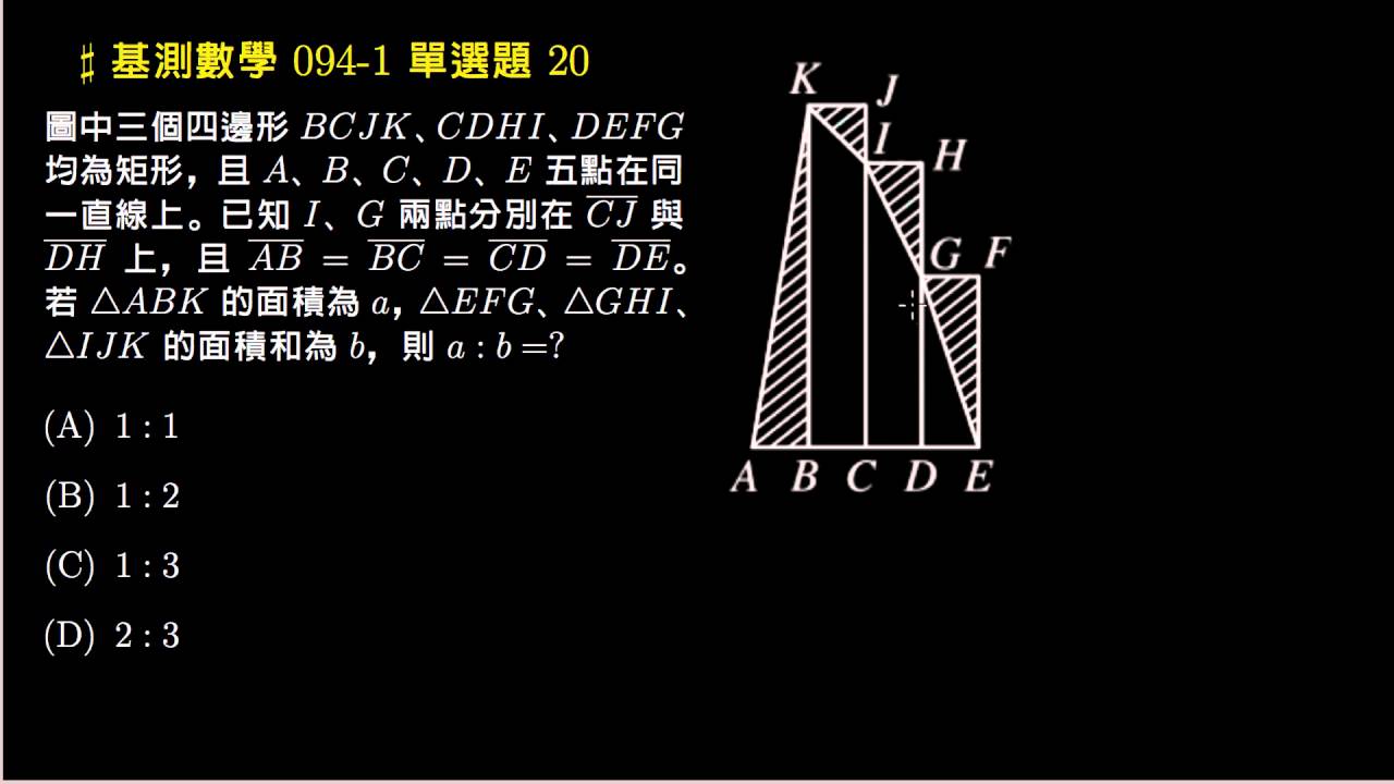 載入中... 相關課程 Back 【基測數學】94v1 單選20:三角形面積比 相關課程 0 / 750 登入觀看 ⇐ Use this menu to view and help create subtitles for this video in many different languages. You'll probably want to hide YouTube's captions if using these subtitles. 【基測數學】94v1 單選20:三角形面積比 上傳學習單 下載學習單