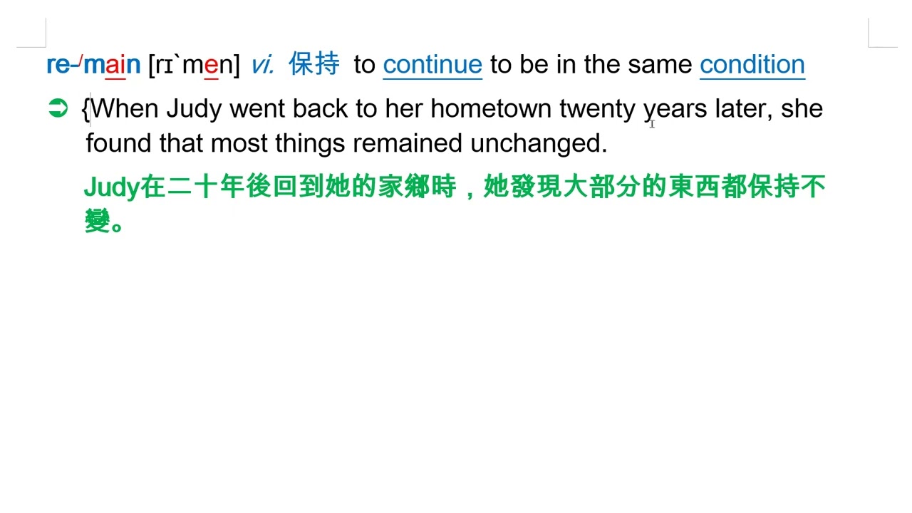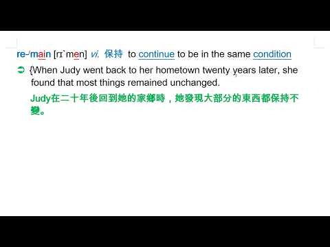 載入中... 相關課程 Back remain [rɪ`men] vi. 保持 相關課程 0 / 750 登入觀看 ⇐ Use this menu to view and help create subtitles for this video in many different languages. You'll probably want to hide YouTube's captions if using these subtitles. remain [rɪ`men] vi. 保持 上傳學習單 下載學習單