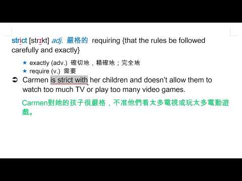 載入中... 相關課程 Back strict [strɪkt] adj. 嚴格的 相關課程 0 / 750 登入觀看 ⇐ Use this menu to view and help create subtitles for this video in many different languages. You'll probably want to hide YouTube's captions if using these subtitles. strict [strɪkt] adj. 嚴格的 上傳學習單 下載學習單