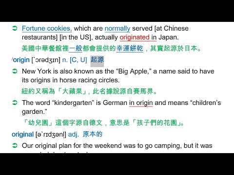 載入中... 相關課程 Back originate [ə`rɪdʒəˏnet] vi. 起源 相關課程 0 / 750 登入觀看 ⇐ Use this menu to view and help create subtitles for this video in many different languages. You'll probably want to hide YouTube's captions if using these subtitles. originate [ə`rɪdʒəˏnet] vi. 起源 上傳學習單 下載學習單