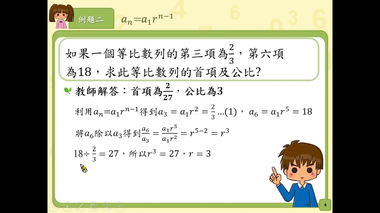載入中... 相關課程 Back N-8-6-S03_了解等比數列,公比為r,第n項的公式為an=a1rn-1。 相關課程 0 / 750 登入觀看 ⇐ Use this menu to view and help create subtitles for this video in many different languages. You'll probably want to hide YouTube's captions if using these subtitles. N-8-6-S03_了解等比數列,公比為r,第n項的公式為an=a1rn-1。 上傳學習單 下載學習單