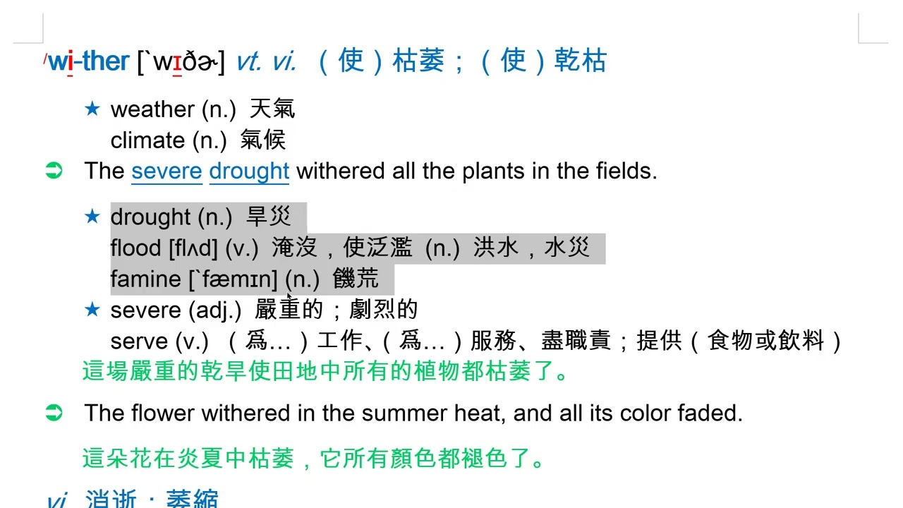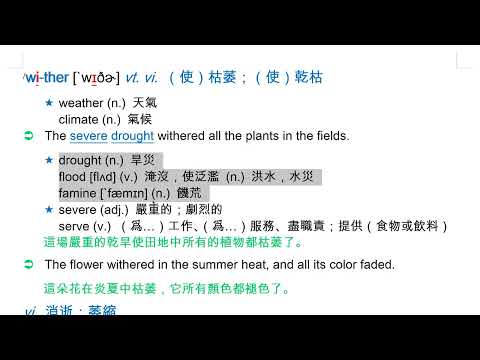 載入中... 相關課程 Back wither [`wɪðɚ] vt. vi. (使)枯萎;(使)乾枯 相關課程 0 / 750 登入觀看 ⇐ Use this menu to view and help create subtitles for this video in many different languages. You'll probably want to hide YouTube's captions if using these subtitles. wither [`wɪðɚ] vt. vi. (使)枯萎;(使)乾枯 上傳學習單 下載學習單