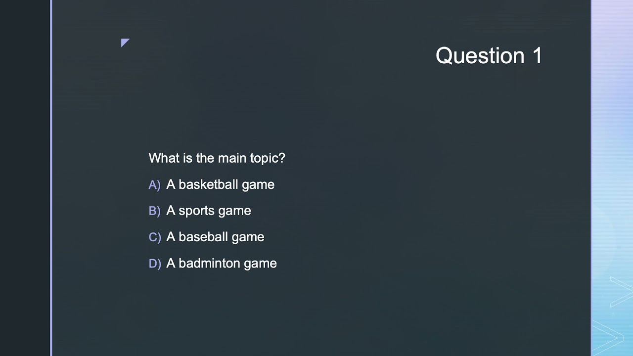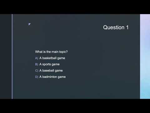 載入中... 相關課程 Back 主題閱讀:What Time Is the Basketball Competition? 相關課程 0 / 750 登入觀看 ⇐ Use this menu to view and help create subtitles for this video in many different languages. You'll probably want to hide YouTube's captions if using these subtitles. 主題閱讀:What Time Is the Basketball Competition? 上傳學習單 下載學習單