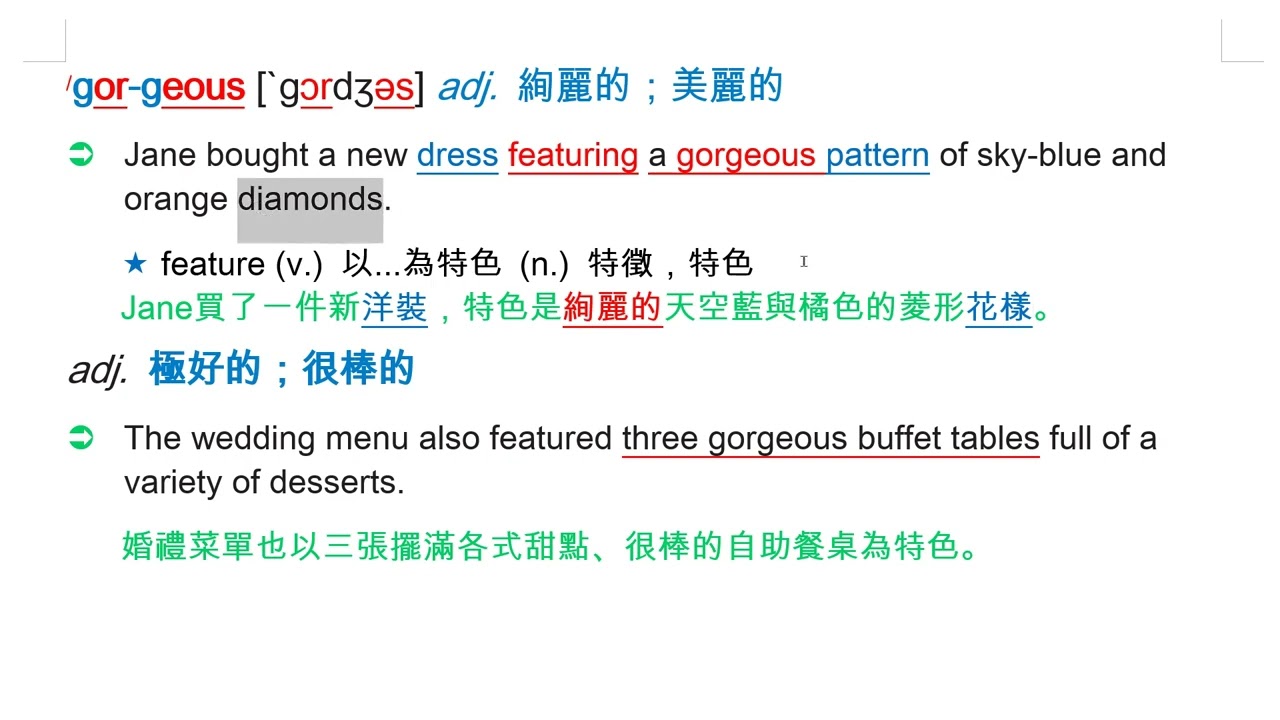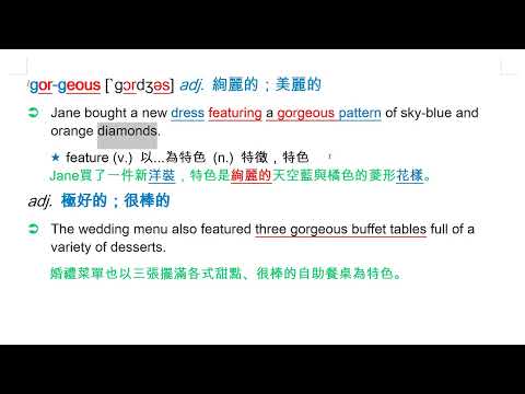 載入中... 相關課程 Back gorgeous [`gɔrdʒəs] adj. 絢麗的;美麗的 相關課程 0 / 750 登入觀看 ⇐ Use this menu to view and help create subtitles for this video in many different languages. You'll probably want to hide YouTube's captions if using these subtitles. gorgeous [`gɔrdʒəs] adj. 絢麗的;美麗的 上傳學習單 下載學習單