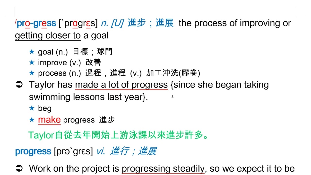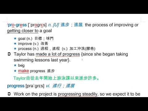 載入中... 相關課程 Back progress [`prɑgrɛs] n. [U] 進步;進展 相關課程 0 / 750 登入觀看 ⇐ Use this menu to view and help create subtitles for this video in many different languages. You'll probably want to hide YouTube's captions if using these subtitles. progress [`prɑgrɛs] n. [U] 進步;進展 上傳學習單 下載學習單