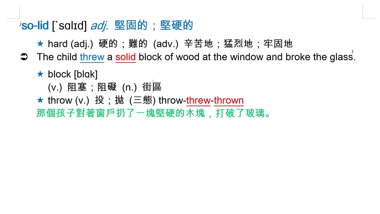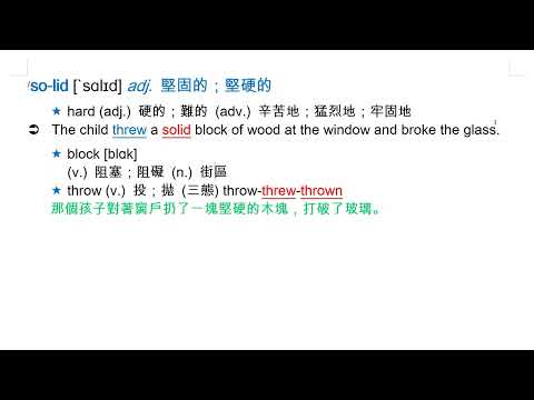 載入中... 相關課程 Back solid [`sɑlɪd] adj. 堅固的;堅硬的 相關課程 0 / 750 登入觀看 ⇐ Use this menu to view and help create subtitles for this video in many different languages. You'll probably want to hide YouTube's captions if using these subtitles. solid [`sɑlɪd] adj. 堅固的;堅硬的 上傳學習單 下載學習單