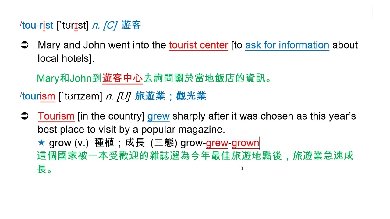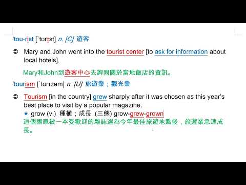 載入中... 相關課程 Back tourist [`tʊrɪst] n. [C] 遊客 相關課程 0 / 750 登入觀看 ⇐ Use this menu to view and help create subtitles for this video in many different languages. You'll probably want to hide YouTube's captions if using these subtitles. tourist [`tʊrɪst] n. [C] 遊客 上傳學習單 下載學習單
