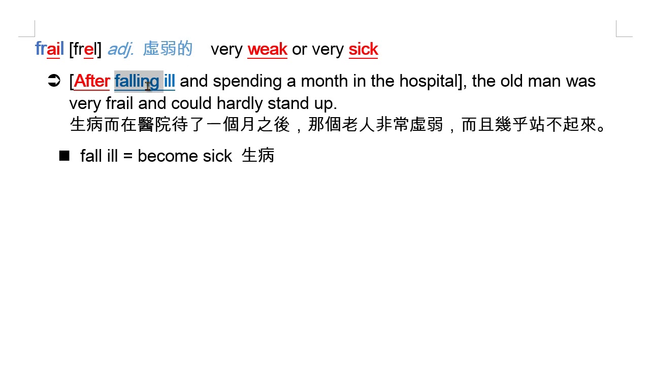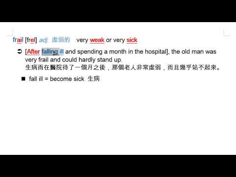 載入中... 相關課程 Back frail (adj.) 虛弱的 相關課程 0 / 750 登入觀看 ⇐ Use this menu to view and help create subtitles for this video in many different languages. You'll probably want to hide YouTube's captions if using these subtitles. frail (adj.) 虛弱的 上傳學習單 下載學習單