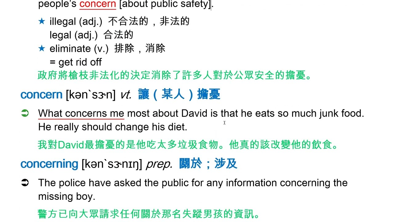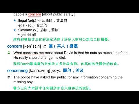 載入中... 相關課程 Back concern [kən`sɝn] n. [C, U] 擔心(的事);憂慮 相關課程 0 / 750 登入觀看 ⇐ Use this menu to view and help create subtitles for this video in many different languages. You'll probably want to hide YouTube's captions if using these subtitles. concern [kən`sɝn] n. [C, U] 擔心(的事);憂慮 上傳學習單 下載學習單