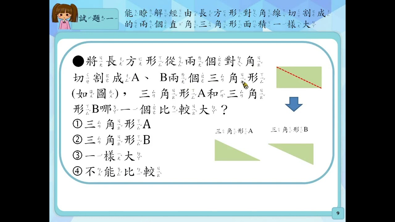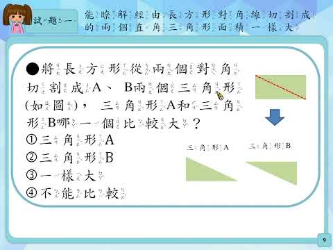 載入中... 相關課程 Back S-3-4-S03 能經由長方形對角線切割成兩個直角三角形,認識該三角形面積 相關課程 0 / 750 登入觀看 ⇐ Use this menu to view and help create subtitles for this video in many different languages. You'll probably want to hide YouTube's captions if using these subtitles. S-3-4-S03 能經由長方形對角線切割成兩個直角三角形,認識該三角形面積 上傳學習單 下載學習單