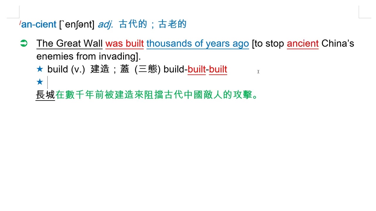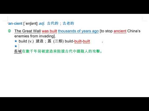 載入中... 相關課程 Back ancient [`enʃənt] adj. 古代的;古老的 相關課程 0 / 750 登入觀看 ⇐ Use this menu to view and help create subtitles for this video in many different languages. You'll probably want to hide YouTube's captions if using these subtitles. ancient [`enʃənt] adj. 古代的;古老的 上傳學習單 下載學習單