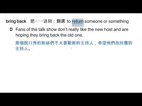 載入中... 相關課程 Back bring back 把⋯⋯送回;歸還 相關課程 0 / 750 登入觀看 ⇐ Use this menu to view and help create subtitles for this video in many different languages. You'll probably want to hide YouTube's captions if using these subtitles. bring back 把⋯⋯送回;歸還 上傳學習單 下載學習單