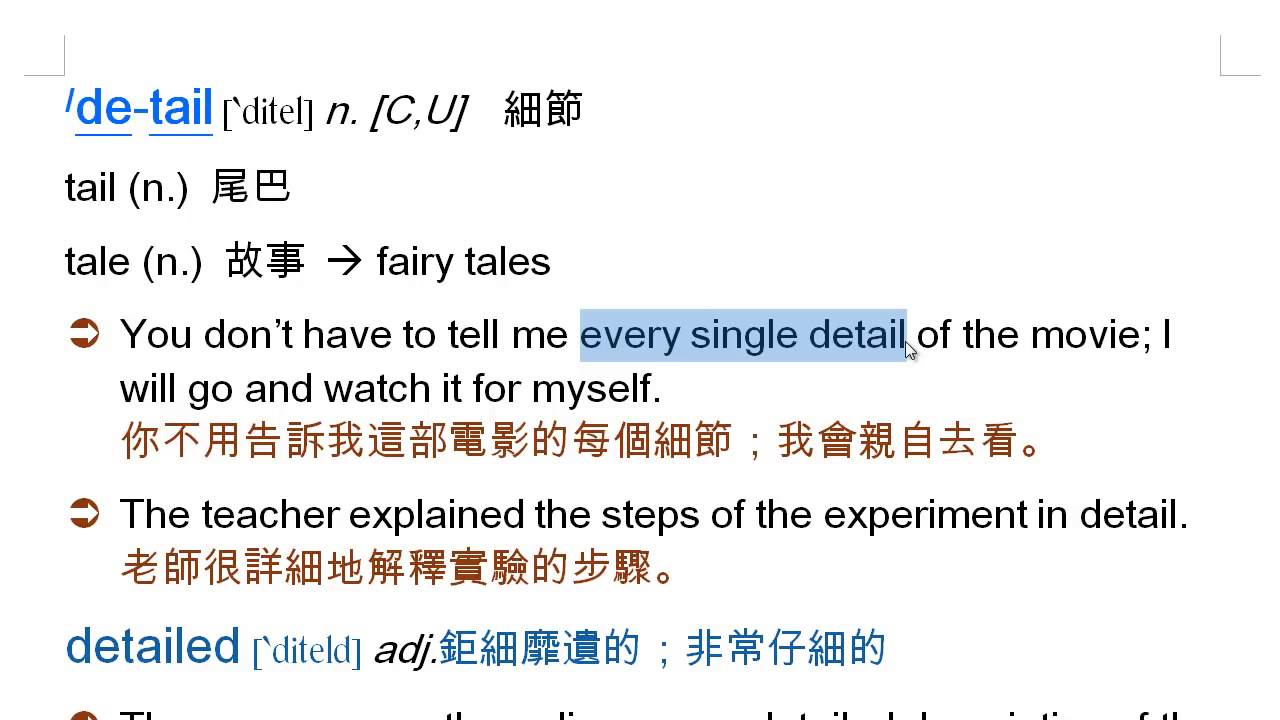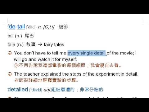 載入中... 相關課程 Back detail: 細節, detailed, 詳細的, 鉅細靡遺的 相關課程 0 / 750 登入觀看 ⇐ Use this menu to view and help create subtitles for this video in many different languages. You'll probably want to hide YouTube's captions if using these subtitles. detail: 細節, detailed, 詳細的, 鉅細靡遺的 上傳學習單 下載學習單