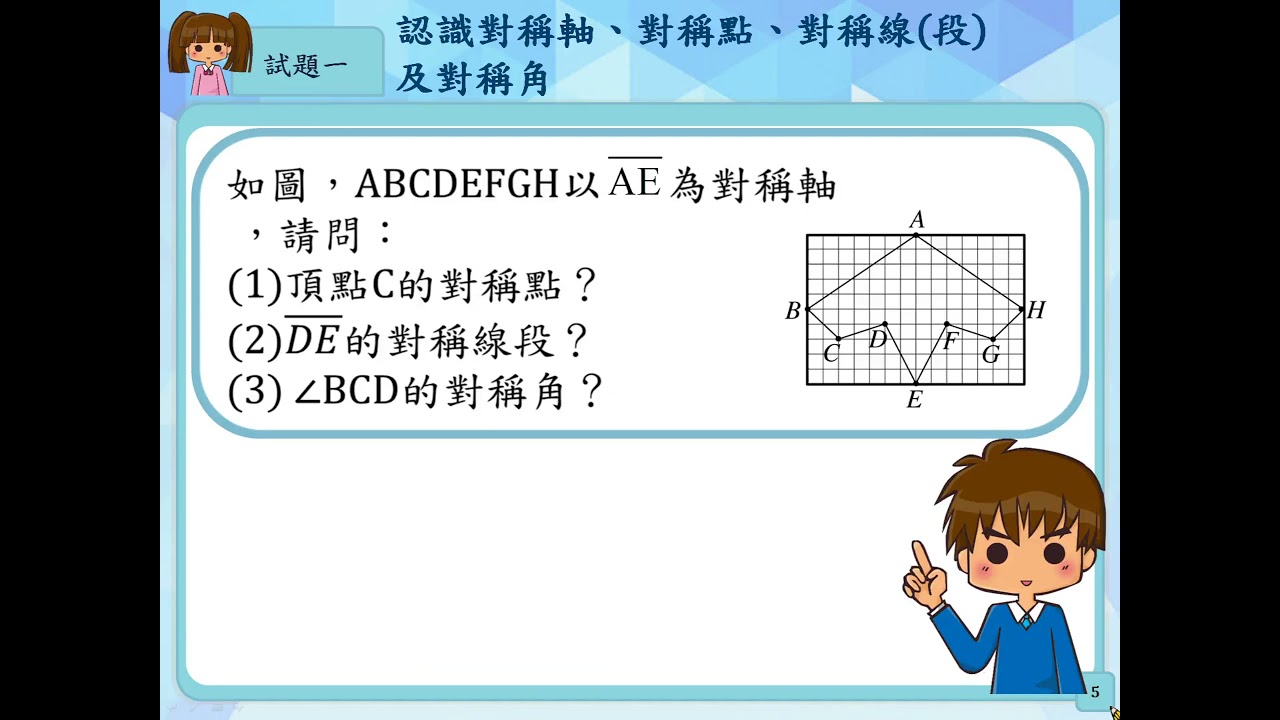 載入中... 相關課程 Back S-7-4-S03_認識對稱軸、對稱點、對稱線(段)及對稱角。 相關課程 0 / 750 登入觀看 ⇐ Use this menu to view and help create subtitles for this video in many different languages. You'll probably want to hide YouTube's captions if using these subtitles. S-7-4-S03_認識對稱軸、對稱點、對稱線(段)及對稱角。 上傳學習單 下載學習單