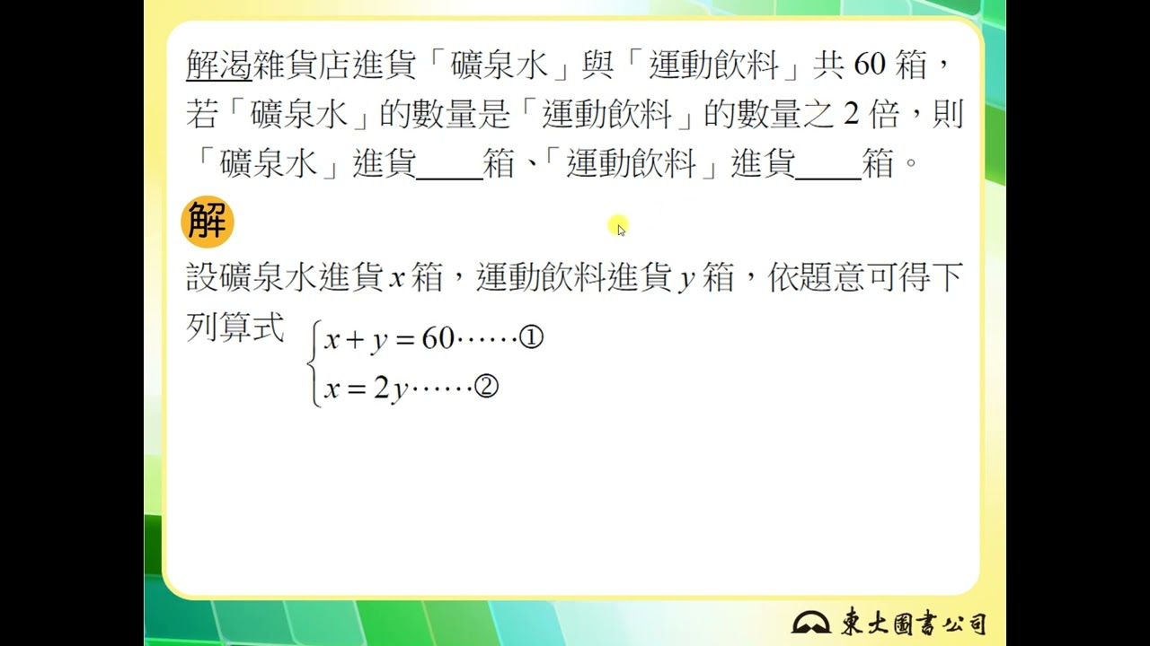 載入中... 相關課程 Back 【解題】解三元一次方程組 相關課程 0 / 750 登入觀看 ⇐ Use this menu to view and help create subtitles for this video in many different languages. You'll probably want to hide YouTube's captions if using these subtitles. 【解題】解三元一次方程組 上傳學習單 下載學習單