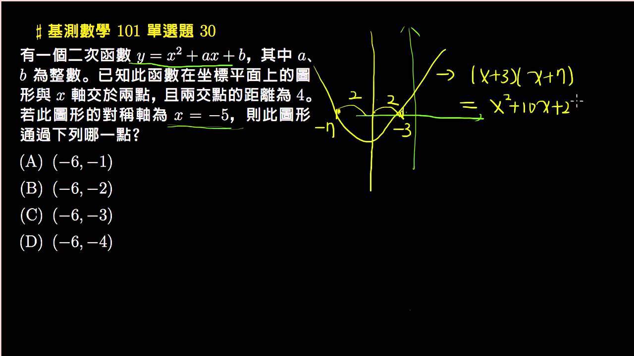 載入中... 相關課程 Back 【基測數學】101 單選30:二次函數、對稱軸 相關課程 0 / 750 登入觀看 ⇐ Use this menu to view and help create subtitles for this video in many different languages. You'll probably want to hide YouTube's captions if using these subtitles. 【基測數學】101 單選30:二次函數、對稱軸 上傳學習單 下載學習單